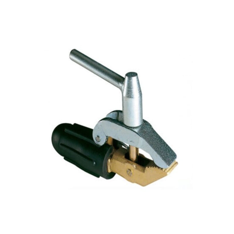 Morsetto di massa Delta 6, corpo in ottone pressofuso, leva di serraggio in acciaio zincato, ganascia mobile, contatto basculante, per alti amperaggi su postazioni fisse con presa stabile e sicura, manicotto di rivestimento in materiale isolante resistente al calore.